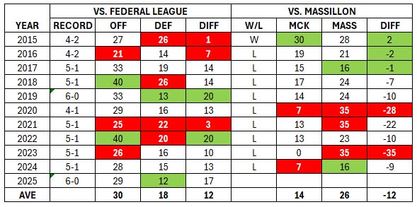 The chart below provides some data on McKinley against Federal League competition during the reign of Coach Moore. The data gives an indication that the Bulldogs this year are on par with the offense, but have one of their better defenses.