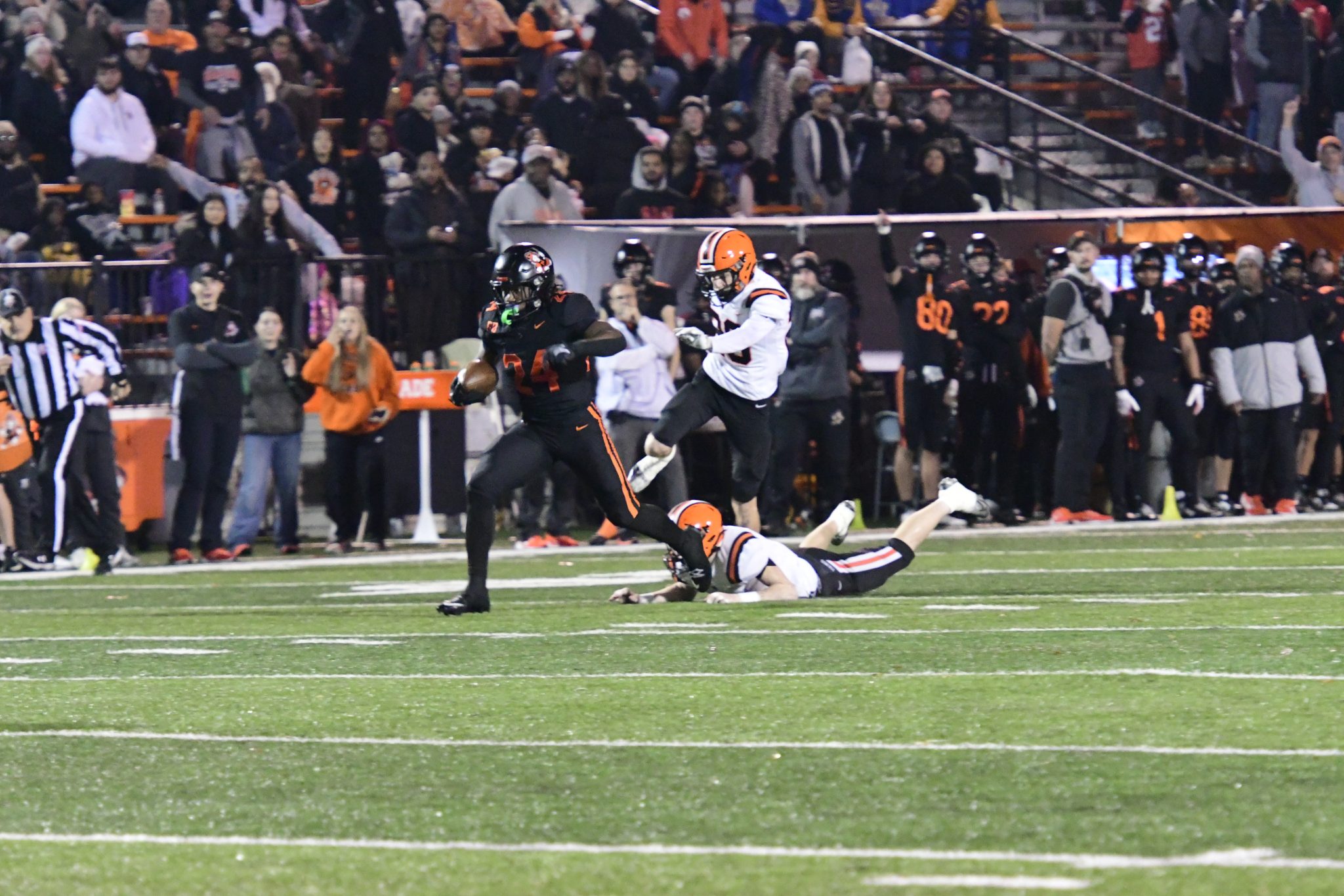 The first team had one final series to start the second half, which ended in a 16-yard pass to a wide-open Thigpen. The backups then quickly finished it off under a running clock. Even this group scored. At the end of a 9-play, 45-yard drive, quarterback Eli Moore vacated the pocket when he couldn’t find an open receiver and outraced the defense to the left edge of the goal line. It was the final touchdown of the ten games played at home this year, fittingly scored by the coach’s son.