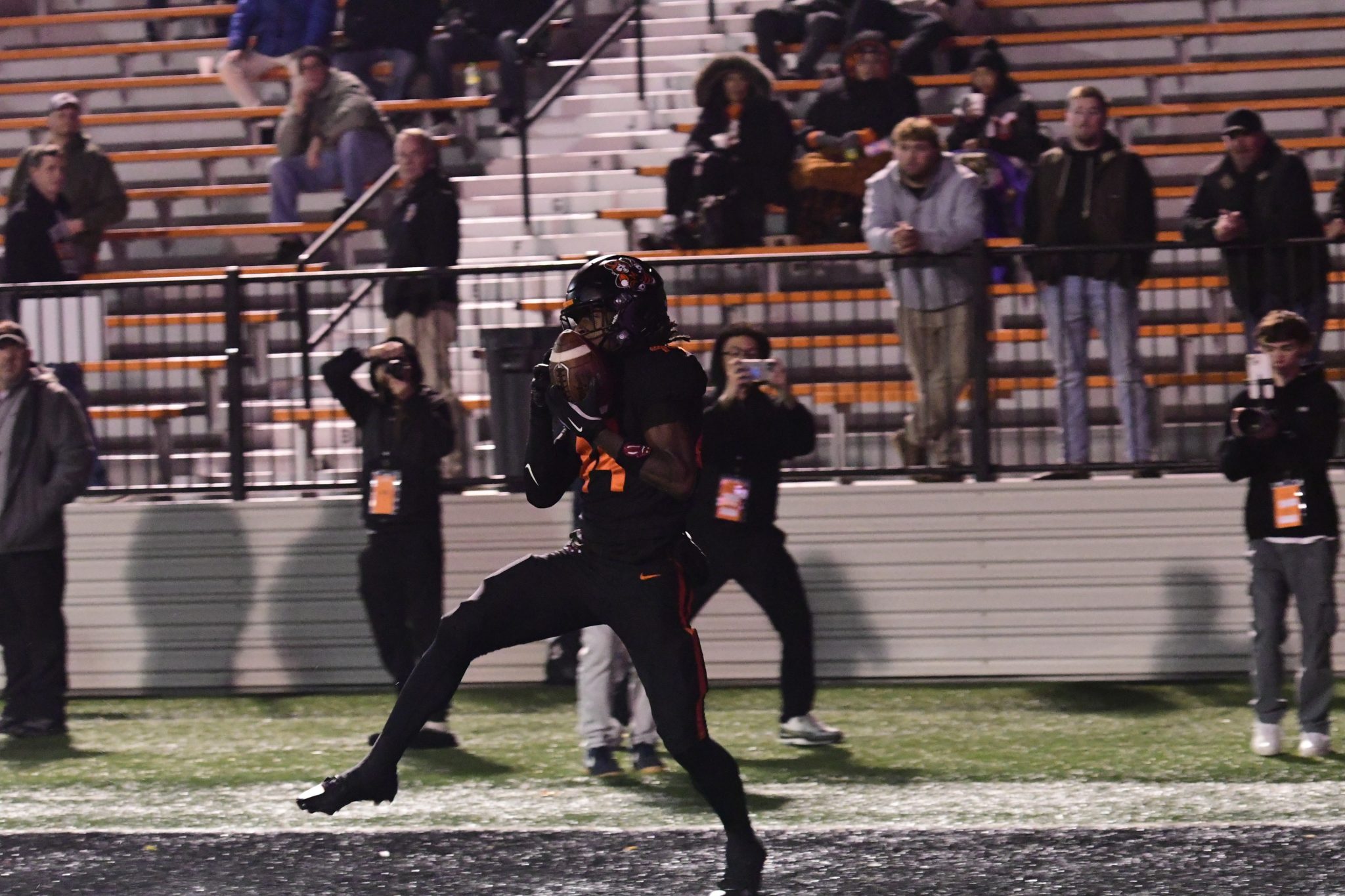 Four touchdowns were tallied in the second quarter: a 46-yard run by McMullen, a 21-yard pass to Thigpen, a 66-yard catch-and-run pass to Malone and a 20-yard pass to Jackson in the corner of the end zone. That made the halftime score 42-7, with 350 yards of offense in the books.